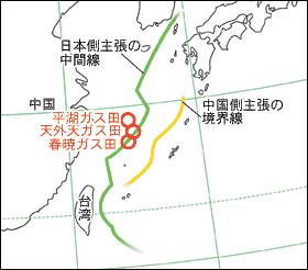 問題のガス田の場所は、地図を見ればわかるように、沖縄諸島と中国大陸の中間付近にあります。ここで中国側が、海底に埋蔵されている天然ガスの採掘を始めているのです。