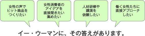 講演を依頼したい 働く女性たちに直接アプローチしたい 女性の声でヒット商品をつくりたい 女性消費者のアイデアを直接聞きたい集めたい 人材研修を依頼したい