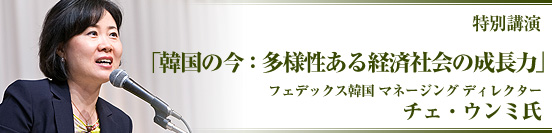 コースランチの後、フェデックス韓国マネージングディレクターを務めるチェ・ウンミさんによる特別講演が始まりました。講演タイトルは、「韓国の今:多様性ある経済社会の成長力」。