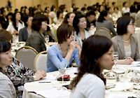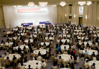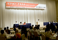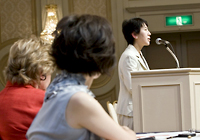 2007年7月15日午前10時。いよいよ「第12回国際女性ビジネス会議」が始まりました。朝8時前から、会場前に行列をつくり、前からどんどん席を確保していった熱心な参加者を前に、実行委員長の佐々木かをりが挨拶をすると、会場が一気に集中します。いよいよスタートです。日本中、海外からも会場いっぱいに集まった約1000人の参加者の前に、特別講演者の枝廣淳子氏が登場しました。
