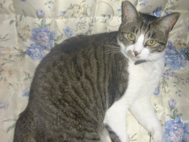 ミミーちゃんは、もうすぐ3歳。3年前、手のひらに乗るくらいのやせた子猫がわが家に迷い込んできました。先住の3匹の猫ちゃんたちの仲間になり、今では1番の位に。ただ1匹の女の子なんです。このコーナーができたのを知って、早速さっき撮影しました。一番のお気に入りのソファの上で。