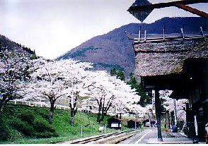 福島県湯野上温泉駅はかやぶき屋根です。折からサクラが満開でした。