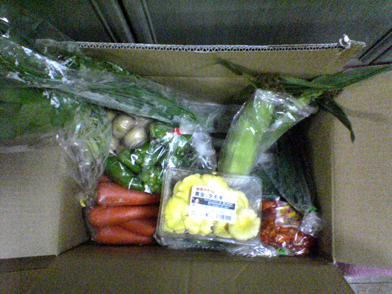 ネットでよく買い物をしている、静岡の八百屋さんから届いた「おまかせセット」です。お値段は毎回決まっていて、その中で旬のものを店長さんが選んで入れてくれます。中央の黄色いのは、「こがねタモギタケ」。新種のきのこだそうです。写真のとうもろこしは甘くておいしいです!おまけも入れて17種類もあり、大変お買い得なセットです。2週間に1度届くのですよ。