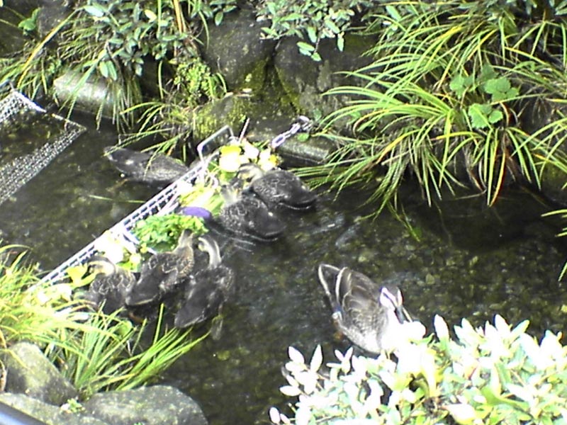 子ガモが小松菜をつついて食べている間、母ガモは周りをしっかりと見張っています。この小松菜は、水の中に誰かが入れたもののようです。小松菜を束ねてあるビニールのひもを外さないと、カモが間違って飲み込んでしまうのではないかと少し心配になりました。