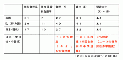 つまり、現在より税・社会保険料負担が数%程度増加し、歳出面の規模も今より若干大きくなるというイメージです。この数字はOECDの使うGDP比なので、我が国独自の概念である国民所得比に置き換えると、税・社会保険料負担合計40%前後ということになります。今後、欧州並みの社会保障内容を維持しつつ、負担については、社会保障をふくめた歳出削減を進めることによって、欧州よりは低く、米国よりは高いレベルの負担増をめざす、という姿になるのでしょう。