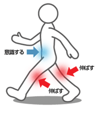 その際、気を付けていただきたいのは、歩き方です。踏み出す側の足と後ろ側の足、両方のひざの裏側を伸ばし、腕は後ろに引きながら歩くよう、意識してみてください。腰から歩くイメージです。筋肉というのは、意識しないと動かないといいますから、ヒップアップやおなかを引っ込めることを目指して、ポイントを意識して歩くことをおすすめします。